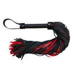 Leather Handle Long Leather Flogger in Burgundy Snake Print and Black with Black Accessories.