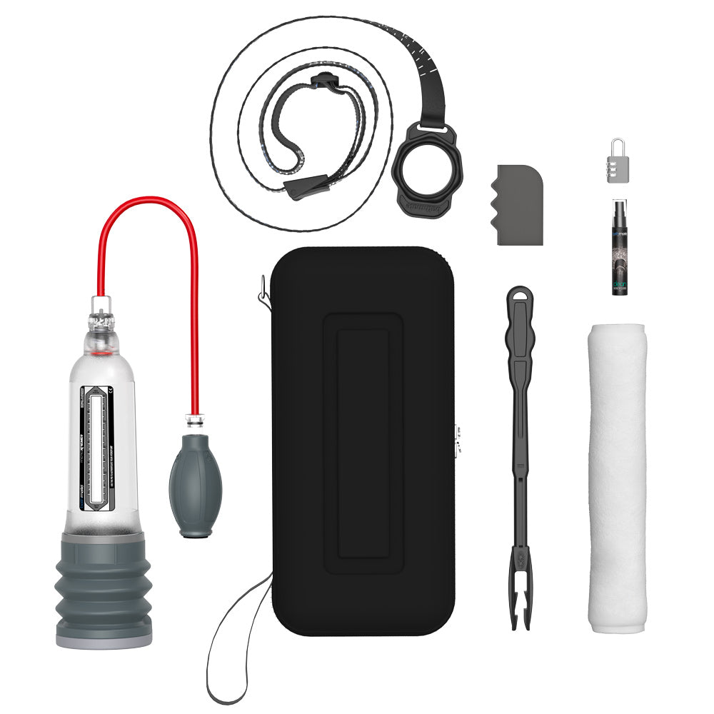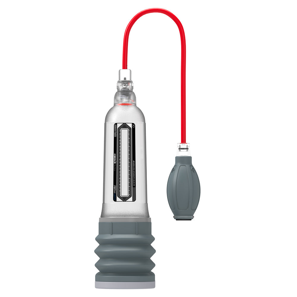 Design for a penis size of 7 to 9 Inches when erect The Bathmate Hydroxtreme 9 is the ultimate male hydrotherapy pump designed to be used in the shower or bathtub. Utilising the amazing power of water Bathmate Hydropumps give the user an erection in a completely safe, controllable manner and remain the most sophisticated external penile rigidity devices available. Manufactured using state of the art dermatologically tested materials Bathmate Hydropump are certified as skin safe, latex free, phthalate free and covered by a comprehensive two-year guarantee. Come complete Security. Carry case Measuring Gauge Shower Strap Cleaning Sponge Bathmate Towel Handball Pump Hose Attachment Comfort Insert Pad 12ml Clean Security Lock