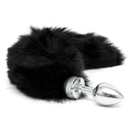 Small smooth stainless steel anal plug with a long black bushy faux tail, all in a black presenatation box. The butt plug is 3.5 inches long, 2.5 of which is insertable. The tail measures 12 inches in length.
